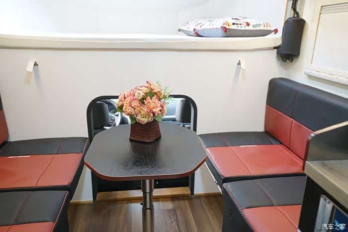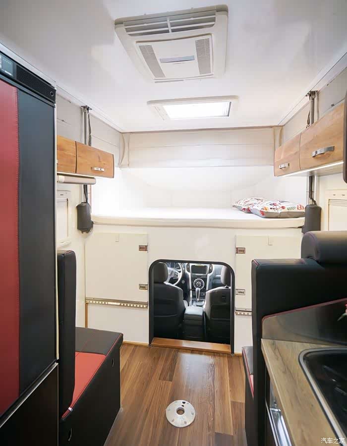 房车内部是实用兼具现代的设计风格。。独立卫浴间,房车专用冷暖空调、储物柜、进口全景天窗、房车专用侧窗、进口正反转排气扇、进口房车专用冰箱、全套户外移动厨房,简单实用。家庭影院系统的加入更是让房车生活与现代智能系统接轨。