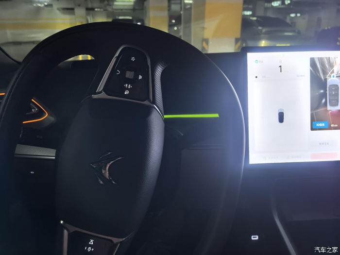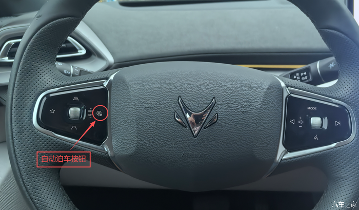 自动泊车有两种激活方式,一种是应用中心的智能泊车,另一种就是方向盘上的这个小按键,画红色小圈圈的地方。