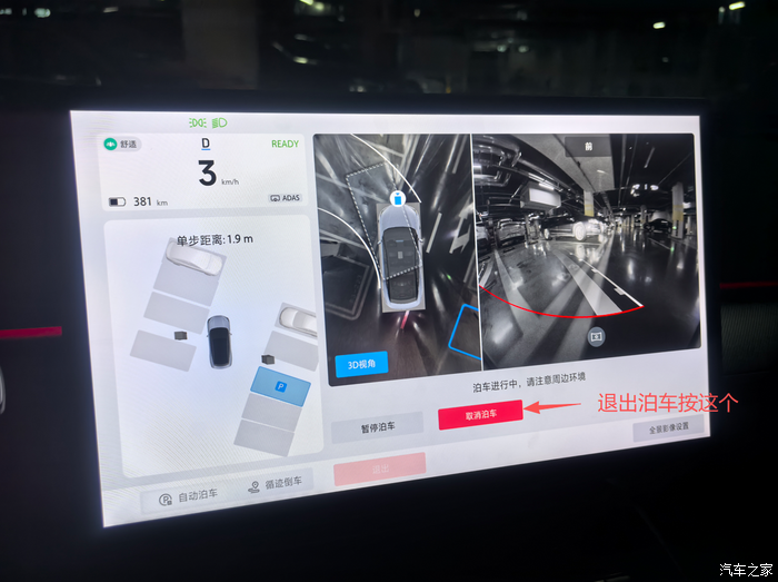 选好了车位之后,点击开始车内泊车,这个时候注意了啊!现在可以解放双手双脚了,车子就会开启自动泊车。全程速度很快,个人感觉比我倒车速度快,我第一次用还真吓了一跳。这个时候如果你踩了刹车,泊车就会停止,提示你是否继续泊车
