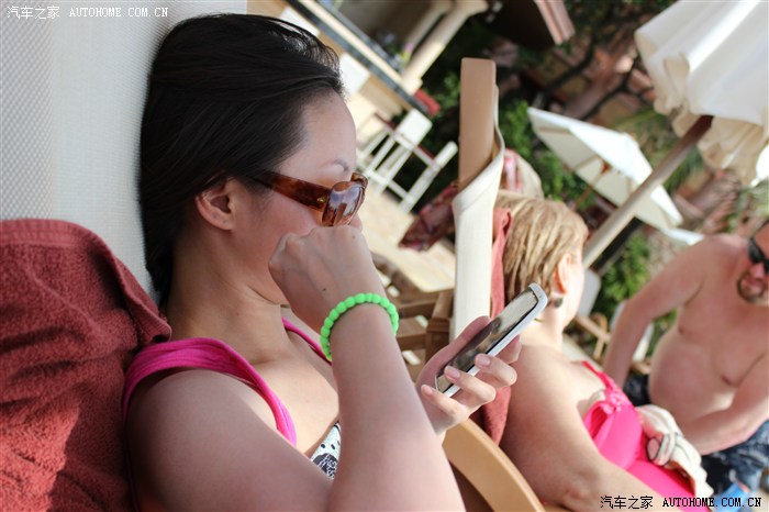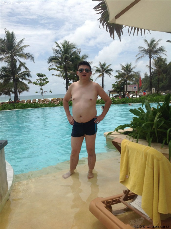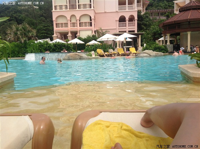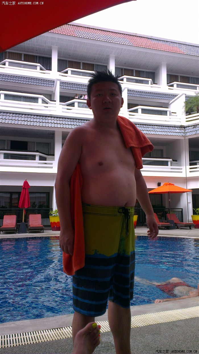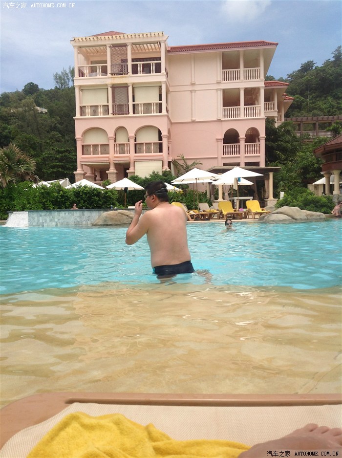手机拍的,一天不占水就难受,再次效仿白人穿着沙滩裤下了水,其实主要因为过会出去逛懒的回房间再换了。泳池还不浅,边上看穿着,感觉是朝鲜来的,不像是韩国人。