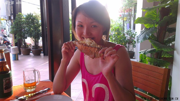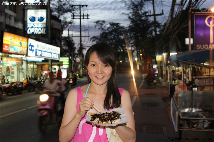 就这样延着沙滩变拍变走,在卡隆公园附近上了马路,开始觅食。来之前我就跟老婆说了,我把要去的饭馆名称、地址、路线都提前在网上看了下,而且打印出来了。口碑主要是看攻略,路线主要是看谷歌街景,所以我非常熟悉用什么方式到这些餐馆(技术进步的结果),包括步行要多久,打车要多少公里,我都大概知道。但是,因为度假游,我想随性点,走哪吃哪,不想很刻意的安排,我告诉老婆,我通过谷歌街景发现沿着沙滩能到一条很热闹的街道,那里有很多餐馆,万一去了不行,我们再使用备选方案。好在没迷路,确实很热闹,老婆先来了个巧克力菠萝饼。备选方案就这样在接下来的4天完全没用上。