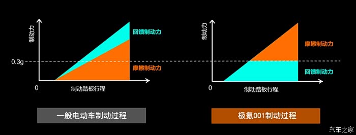 极氪001动能回收的另一个黑科技是将电机回馈制动与制动系统摩擦制动的临界点进行标定:一般的电动车在踩下制动踏板时,回馈制动与摩擦制动同时运行,并随着制动踏板行程逐渐增强;而极氪001在刚踩下制动踏板时只有电机进行回馈制动,随着制动踏板不断深踩,当制动加速度达到0.3g时(急刹),摩擦制动系统才介入工作,这样的设定可以有效的提升动能回收的效率。