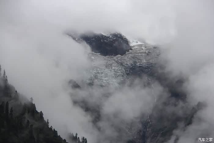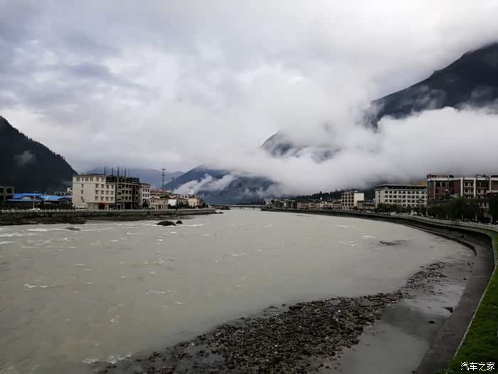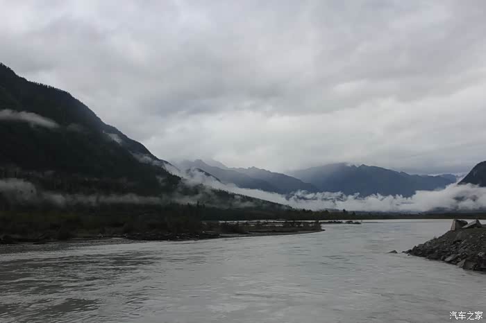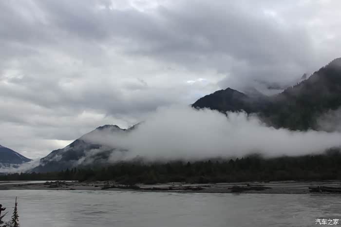 318线一直沿着帕隆藏布河西去。今天虽没有雨,还是阴天, 天公不作美,乌云涌动,但两岸景色美不胜收,虽不见平日湖光潋艳睛方好的美景,但确有山色空朦雨亦奇的梦幻。对岸绿树成荫,绿树丛中点点黄,有秋色的意境了。半山腰白雾飘过,如玉带缭绕,而有的山顶又是白雪皑皑。湍急的河水,白雾漂过的绿林,山顶闪耀的白雪,共同构成一幅美丽的动感的画卷,又别有一番风情。如不是自驾来此,人车入画中,又何时能品尝这般仙境?路边景色变幻可遇不可求的,这也是自驾的乐趣之一,有时真不知道下一步会发生什么,会遇到什么样的景色?什么样美食?什么样有趣的人?前面的事一切都是未知,透着一分神秘和期待。