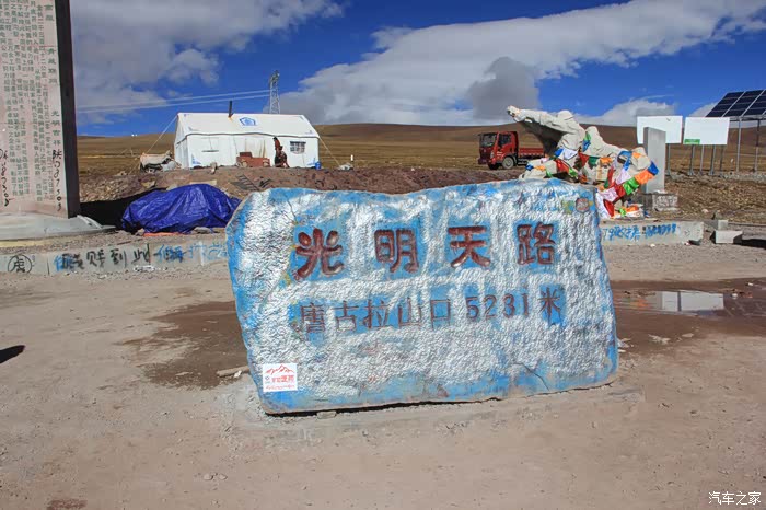 9点半过巨妥拉山,海拔5170米;10点40分,来到唐古拉山口,海拔5231米,这个山口其实很平坦,看不出有什么垭口,夫妻两人均无高反。 唐古拉山口至五道梁一带堵车多次,每次几十分钟至一小时不等。有一次因堵车较长,估计一时半会走不了,好多越野车从道路旁边的草地行驶2公里左右绕过,我只得跟在绕行的车辆后面,小心驾驶,顺利通过堵车路段,算是小小冒险。