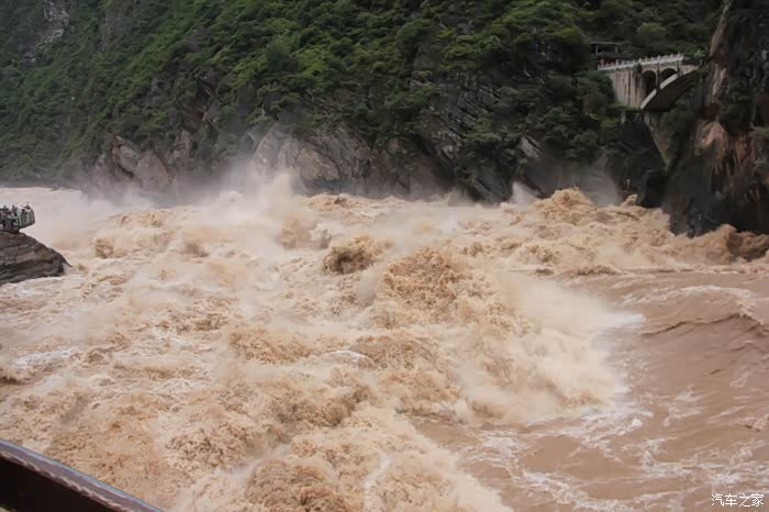 下午二点来到了金沙江上虎跳峡。这是世界上著名的大峡谷,以奇险雄壮著称于世。上虎跳峡是整个峡谷中最窄的一段,江心有一个13米高的大石——虎跳石,巨石犹如孤峰突起,屹然独尊,江流与巨石相互搏击,山轰谷鸣,气势非凡。此时由于上游普降大雨,江中洪水巨浪滚滚,虎跳石淹没于江中,近处朝下观看,洪浪急奔,其势不可挡,让人头晕目眩,心跳加速,有心脏病者尽量避之。有昆明大观楼长联作者孙髯翁《金沙江》诗石刻为证:“劈开蕃域斧无痕,流出犁牛向丽奔。一线中分天作堑,两山夹斗石为门。波摇日月苍藤细,沙走雷霆白昼昏。倒峡翻浪自今古,更从何处觅江源”。写出了虎跳峡来去与凶险。