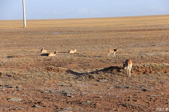 今天计划赶到茶卡镇。在这4500米海拔的高原已经2天,基本上已经适应,不快走或跑路感觉不到是在高原,如果快走还是会气喘吁吁。行车半小时后,就进入了可可西里无人区,高原草场一望无际,已是九月下旬,草原一片金黄。时常有藏羚羊在草地上或觅食或追逐或嬉戏,好不自由随意,从这些可以看到,我国在野生动物保护方面所取得的重大成就。