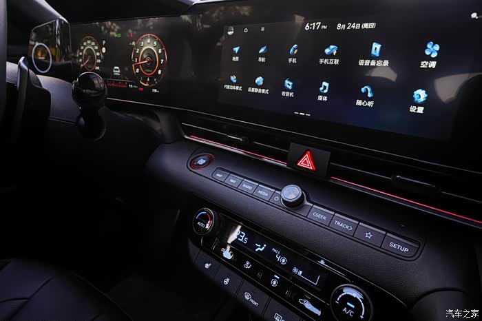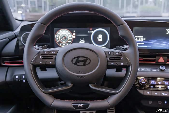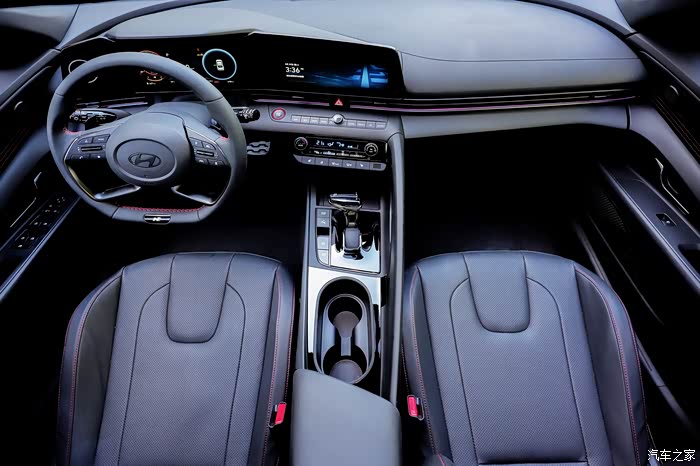 打开车门进入到车内,夭姐发现全新 伊兰特 N Line的运动气息不仅仅局限于外在。整车内饰经过了重新设计。驾驶舱设计起来更加人性化而精致, 大量的红色缝线设计遍布在等驾驶员容易碰触到的地方,而座椅边沿采用细密的红色缝线点缀,搭配平底多功能四幅式方向盘来看,座舱营造出的运动氛围较为浓郁。用料方面,车内虽多以深色塑料和软性材质为主,但是能看出来在做工上比较精致注重细节。