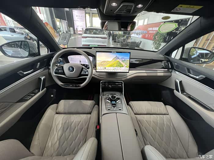 坐进车内,大量软性材质覆盖和皮质包裹,触感舒适。搭配适量的黑色钢琴烤漆饰板以及银色饰板,营造出了豪华的内饰氛围。12.3 英寸全液晶仪表和 15.6 英寸自适应旋转中控大屏十分吸睛,搭载的 DiLink 车机系统功能丰富,支持 OTA 升级、语音四区域唤醒识别、语音连续识别等,操作流畅便捷。车内还配备了智能香氛、50 瓦手机无线充电、方向盘加热、丹拿音响等配置,部分车型还提供 10 点式前排座椅按摩以及后排座椅前后 / 靠背角度调节等,进一步提升驾乘的舒适感。车内采用 2+3+2 的 7 座布局,能够较好地满足大家庭的出行需求。经体验,身高 1.77 米的乘客坐在前排和第二排,头部和腿部空间都较为充裕,第三排对于身材娇小的女生或小孩来说,空间也基本够用。满载 7 人时,后备厢容积为 235L,后两排座椅放倒后,最大可扩展至 1655L,装载能力出色。