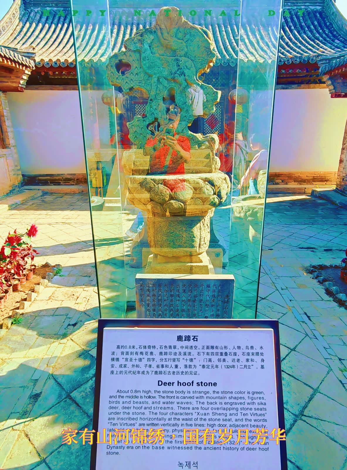 重点介绍正殿前的鹿蹄石,石上刻有“泰定元年(1324年)二月立”字样。传说元朝时杨业第14代孙杨友与杨山在代县驻扎,一次二人狩猎时射中一只梅花鹿,追至代州联庄鹿却遁地而去,二人在此处挖出一巨石,上有带箭的梅花鹿。杨家后人认为此乃祥瑞之兆,遂举族搬迁于此,并将“联庄”改为“鹿蹄箭村”,后又改名“鹿蹄涧村”。