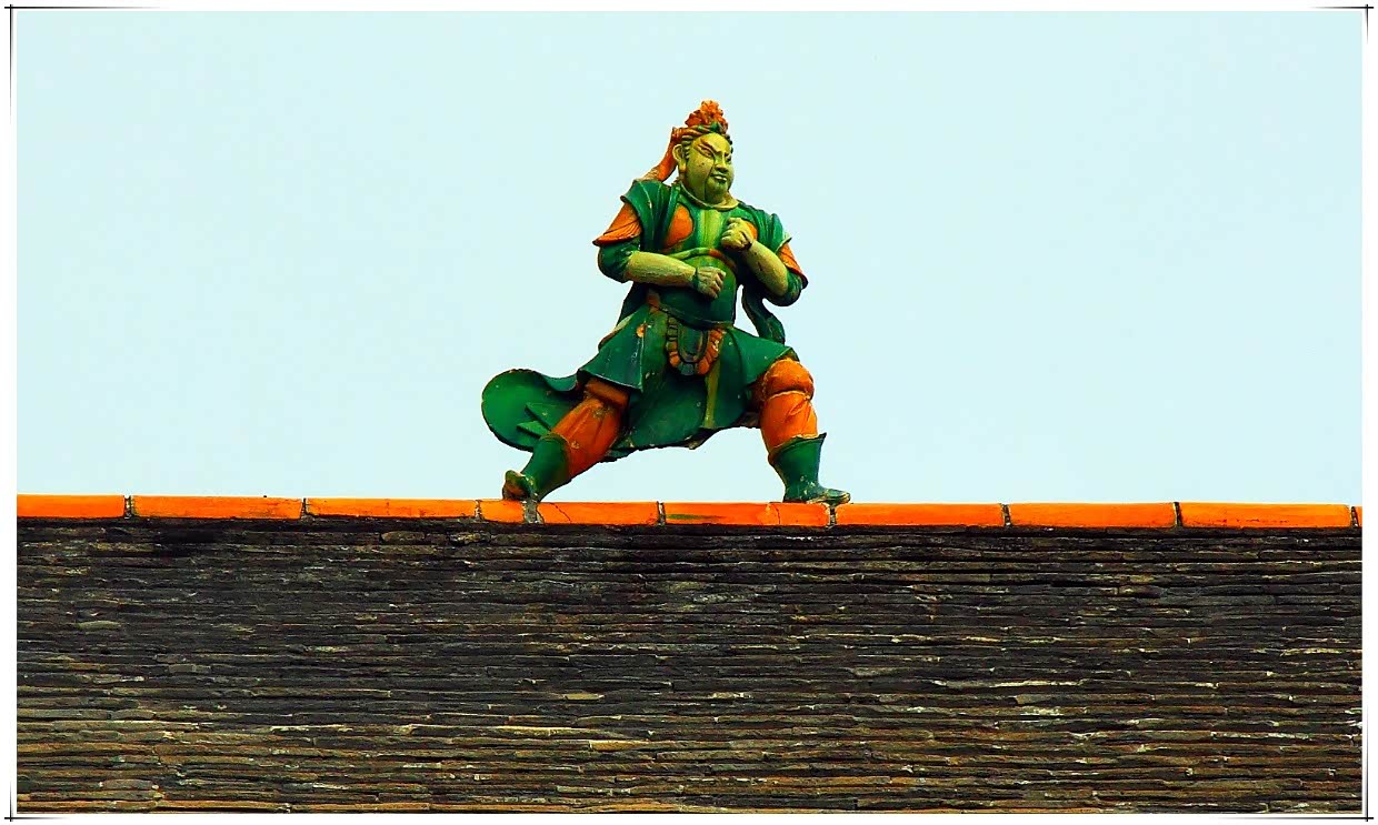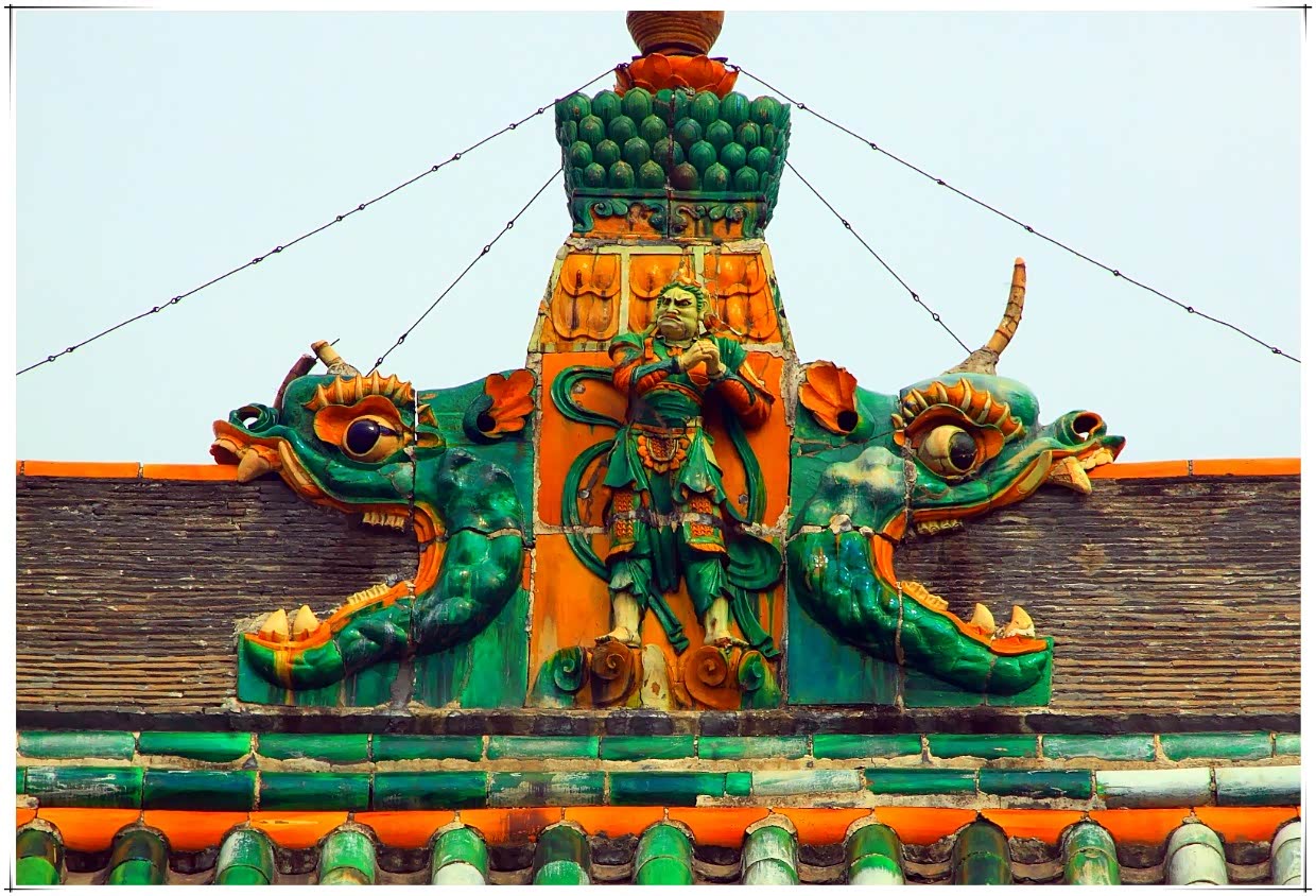 琉璃脊刹中间也有一抱拳武士,可见当时朔地金国尚武之风。所有的琉璃脊刹、脊兽、鸱吻均为金代原物,世间罕见,这就是弥陀殿金代五绝之一——屋脊琉璃。