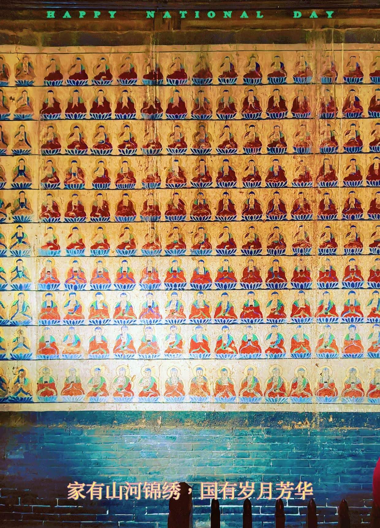 看完塑像,来看弥陀殿金代五绝的最后一绝——金代壁画。现遗存约有320平方米。其中的“顶流”当属殿中西面南壁高达4.68米的千手千眼十一面观世音像,这是我国最为高大的千手观音壁画。由于光线原因,殿内看的不算很清楚。