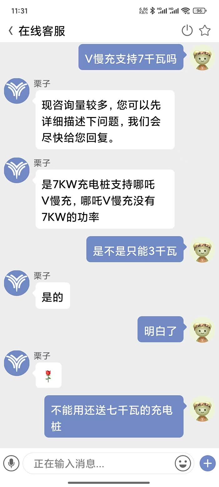 你才知道啊,V300只支持3.5千瓦慢充,我当天在4S上牌有个女人让4S的人忽悠买了V300,听到我讲V300慢充最快3.5千瓦,充电要充十小时,没定速巡航,比V400小十度电,两车价钱差不了多少,当时那女人面都黑了,马上去找销售说车没上牌要换成V400,最后你们都知道结果啦,当时V300还有现金优惠,可惜卖不去!