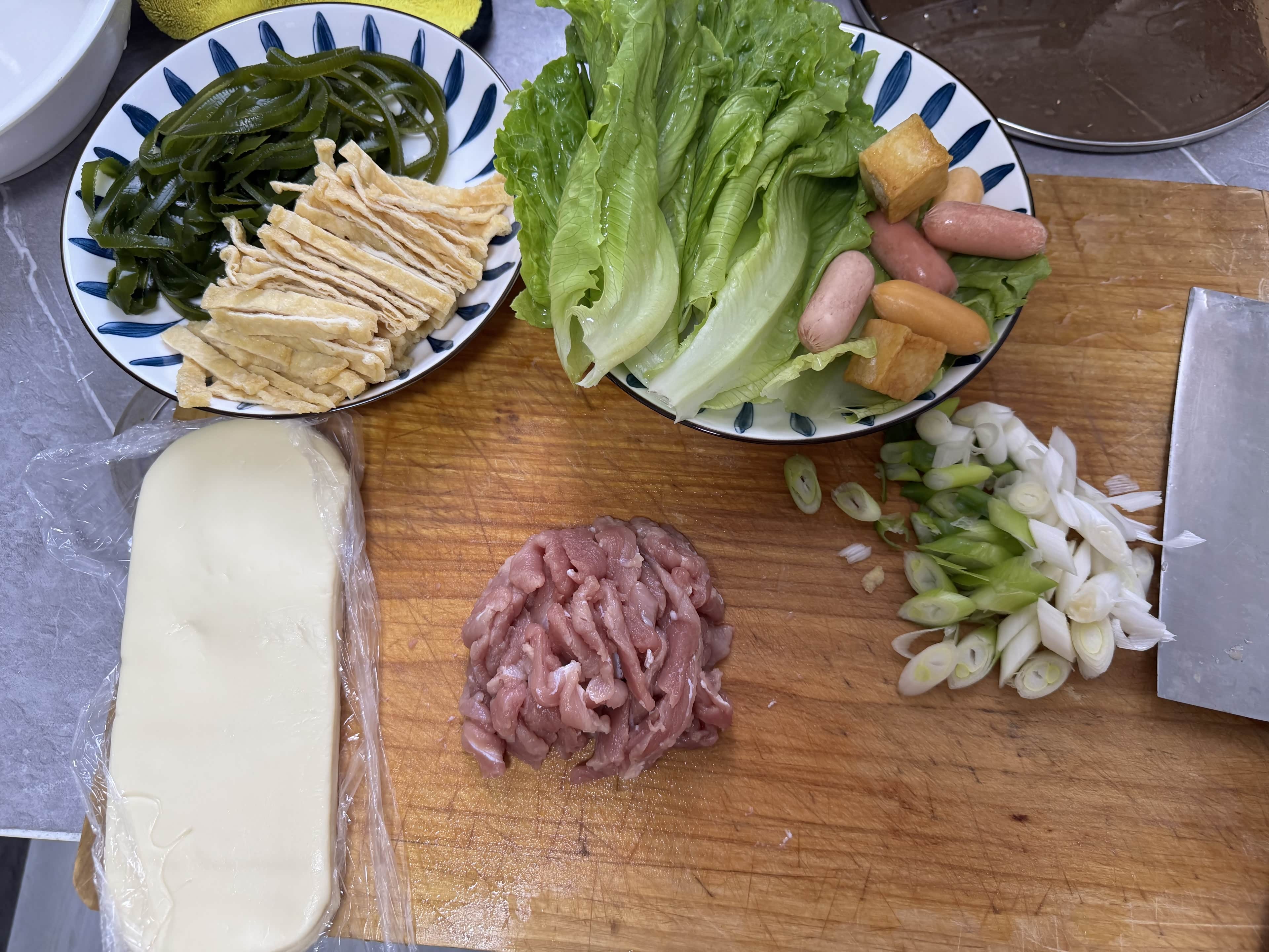 到超市,转来转去,想起来我们河南特色,烩面。有了想做的饭,买食材就快很多了,先去拿烩面片,然后开始选配菜,肉不能少,拿了一小块瘦肉。然后买了海带丝,还有炸豆腐,本来想买点豆腐皮,但是女儿爱吃炸豆腐,家常版嘛,本来就是想吃啥就放啥。然后又拿了颗生菜,一把大葱。晚上吃饭就我俩,所以不能买多,买多明天要吃剩菜了,嘎嘎。