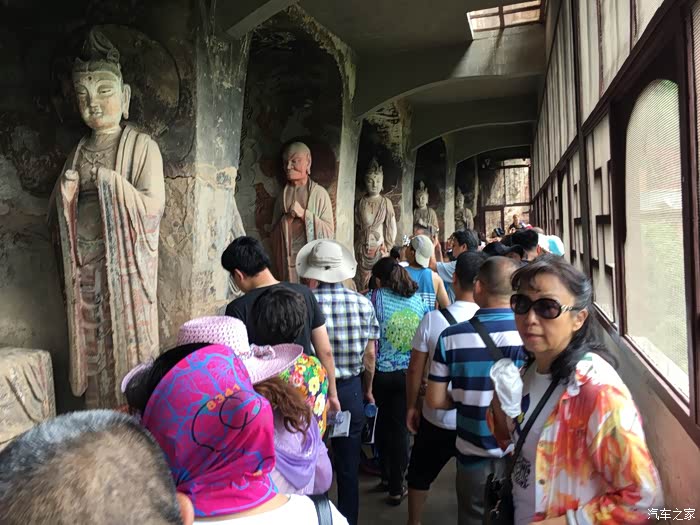 我们驱车来到了莫高窑游客服务中心,在这里办好了门票,首先观看了敦煌莫高窑的影视纪录片,然后统一乘坐景区的大巴车前往十余公里之外的石窑参观游览。莫高窑被誉为二十世纪最有价值的文化发现,其坐落在河西走廊西端的敦煌,以精美的壁画和塑像闻名于世。它始建于前秦时期,历经十六国、北朝、隋、唐等历史朝代的兴建,形成巨大的规模,是世界上现存规模最大、内容最丰富的佛教艺术圣地。我们跟随着导游员仔细地看着、认真地听着,在这里,我们亲眼看到了“飞天”、“反弹琵琶”,了解了泥质彩塑工艺,我深深地为我们伟大的祖国拥有灿烂辉煌的古文明史而骄傲和自豪!