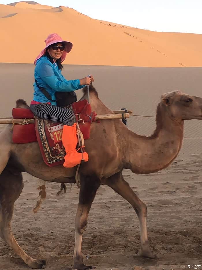 从鸣沙山上下来,我们骑上骆驼开始体验沙漠之行。骑骆驼120元/位,骑行能有5公里的距离,感觉还是物由所值的。景区的骆驼都是家养的,性格比较温顺的。通常每五头骆驼为一组,其主人牵着第一头,每头骆驼的鼻子都用绳子穿着、一个跟着一个乖乖地走着。