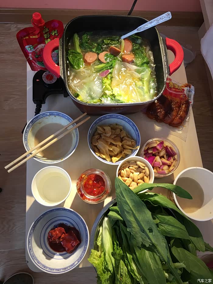 天一直下着小雨,大家好想品尝一下“烂炖”。于是,我出去采购来一些新鲜疏菜,夫人取出小电锅并制作出了第一顿美味佳肴。