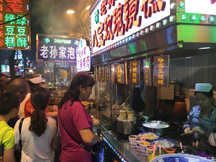 下午15时许,我们进入了古城西安并入住了7天酒店。因我们计划只在西安呆一个晚上,主要还是想自己游玩、品尝小吃,故我就没有再麻烦我的战友们。我们曾不止一次来过西安游玩,对西安还是比较熟悉的。我们又一次爬上西安古城墙、登上钟鼓楼、来到了大燕塔广场。当夜幕降临时,我们逛到了钟楼西侧的回民街,开始品尝小吃。西安最有名的就数回民街,回民街的大名叫鼓楼巷,是一条不大不小的路,两旁现在已经被眼花缭乱的仿古建筑包围。但是,西安本地人并喜欢回民街,一是店大欺客,服务差;二是卫生环境差;三是回民街经营的只是西安***小吃的代表,可西安小吃的美名决不是***食品所能代表的。不过,对于我们外地来的游客来说,这里的小吃品种最集中、也是最热闹的地方了。比较有名气的有:老马家腊牛羊肉、老童家腊牛羊肉、何家卤汁凉粉等很正宗,名声远扬,还有粉蒸肉、灌汤***、柿子饼、炒凉粉、***肉丸糊辣汤、酿皮、牛羊肉泡馍、烤羊肉、涮牛肚等。