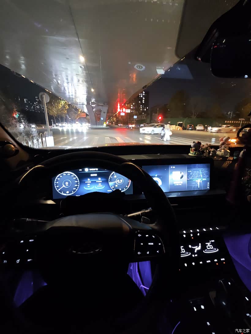 唯独盯着中控上方那枚暗着的车标,有点可惜——要是它能跟着车灯一起亮起来,今晚这裹着夜雾的氛围感,就真的没遗憾了。