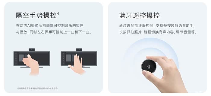 通过选配蓝牙遥控,可进行短按唤醒语音助手,长按抓拍照 片、左短旋转上一曲、右短旋转下一曲等操作。左长旋音量 小、右长旋音量大。