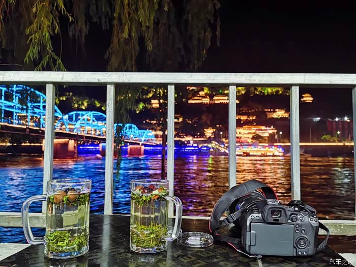 逛吃逛吃的兰州也差不多了,回酒店给Co姐洗漱完,让她先休息了。我们两个大的则想去看看夜色中的中山桥,11点的中山桥人流依然如织,拍完夜景黄河边上找了个位置喝杯茶,感受一下黄河的夜色。