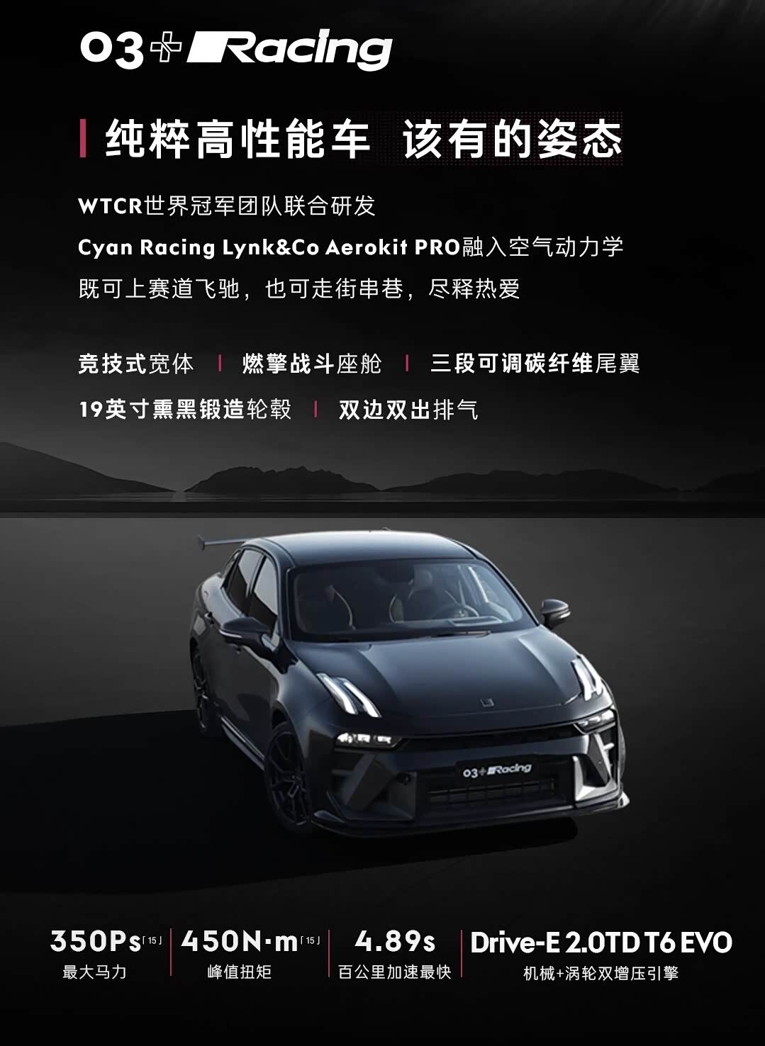 新车全面进阶,搭载2.0 T5 Evo发动机最大马力272Ps,03+性能进阶版搭载2.0 T6发动机最大马力309Ps,03+Racing版、TCR版均 搭载2.OTDT6 EVO发动机机械+涡轮双增压引擎,最大马力350Ps。