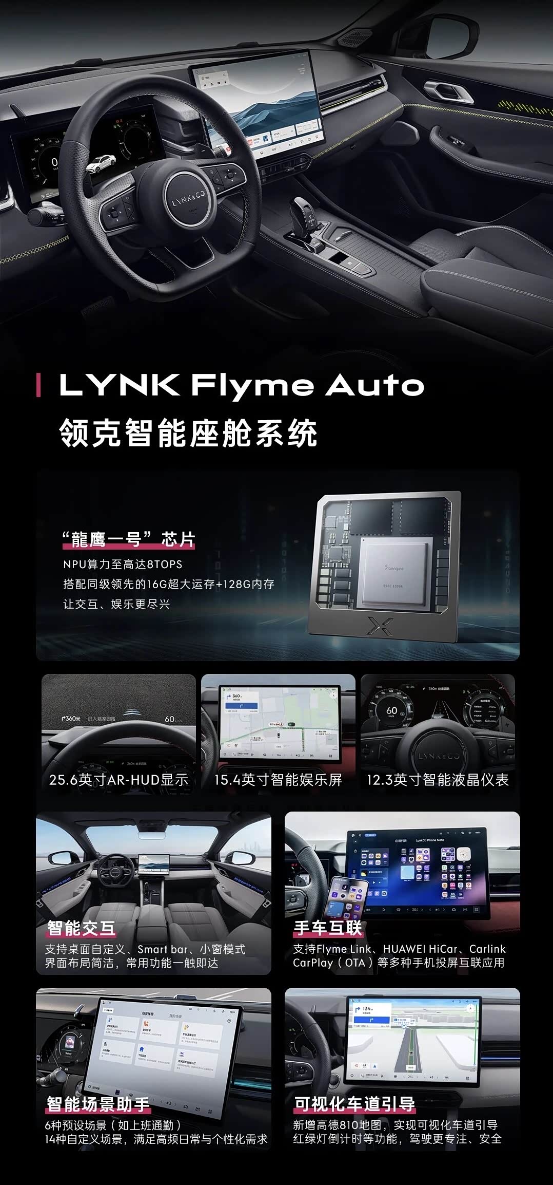 内饰座舱方面:新03推出了红、黑、白三款内饰配色,整体内饰布局与老款一致,15.4英寸中控屏+12.3英寸智能液晶仪表屏+25.6英寸AR-HUD抬头显示,车机上搭载 龙鹰一号 芯片,支持智能交互、智能场景助手、支持持Flyme Link、HiCar、CarPlay等多种手机互联,音响上采用聆境之声领克沉浸音响系统。