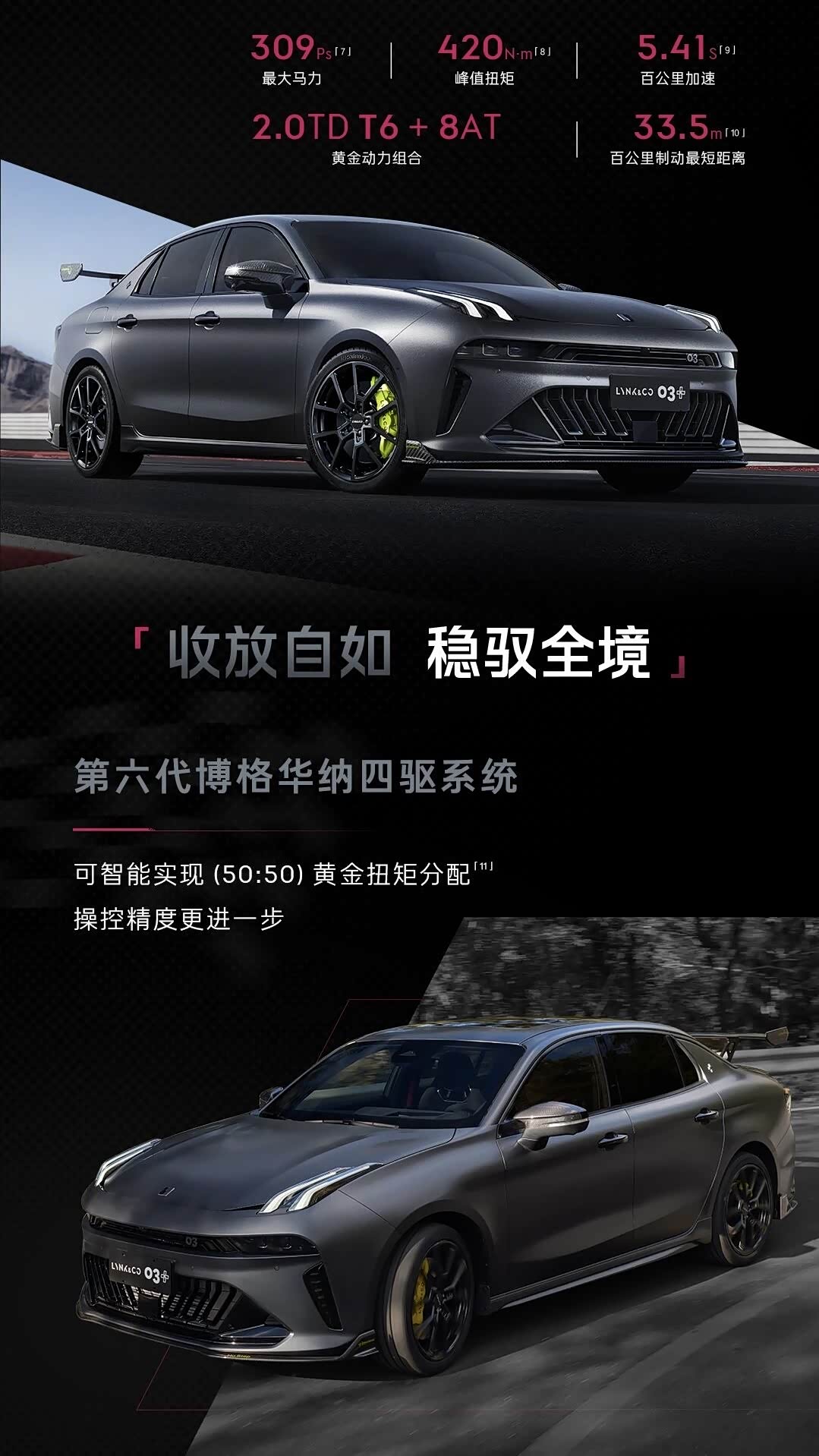 动力方面:领克031.5T版本马力181ps,搭载双离合变速箱,2.0T版马力272Ps搭配8AT变速箱,峰值扭矩400N·m,百公里加速6.5s,百公里最短制动35.5m。 03+性能进阶版搭载2.0 T6发动机+8AT变速箱,最大马力309Ps,峰值扭矩420N·m,百公里加速5.41s,百公里最短制动33.5m,领克03+Racing版则搭载Drive-E 2.OTDT6 EVO机械+涡轮双增压引擎,最大马力350ps,峰值扭矩450N·m,百公里加速4.89s。