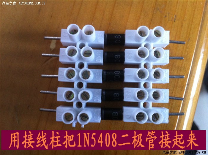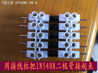 材料明细如下:两毛钱一个的二极管1N5408五个(1N5400到1N5408都行,最大可通3A的电流,因为我同事没改LED阅读灯。我怕用小了不够过)。两元钱的接线柱一排,十个庄头的,从中间一开为二。一条电脑机箱的电源和硬盘显示灯的排线,有四个头的。把发光二级管剪掉就可以用了。