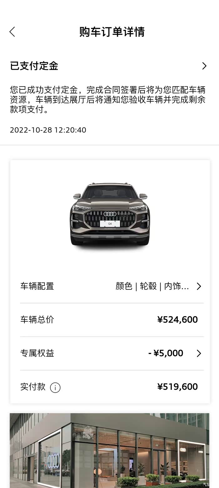 关于Q6,各位大神的视频和贴我都看了,什么MQB平台、麦弗逊、途奥之类的,10月27日,在犹豫了几天后,在权衡资金、配置和外观后,最终放弃飞行家,在没看实车的情况下直接下定Q6齐云型49.96万那一款,由于梅州比较接近厦门,所以选择跨省厦门定车,订车情况如下:厦门地区补贴5000元,加装座椅轮毂2.5万,送行车记录仪、脚垫、贴膜,加2000元贴车衣、400上牌费。