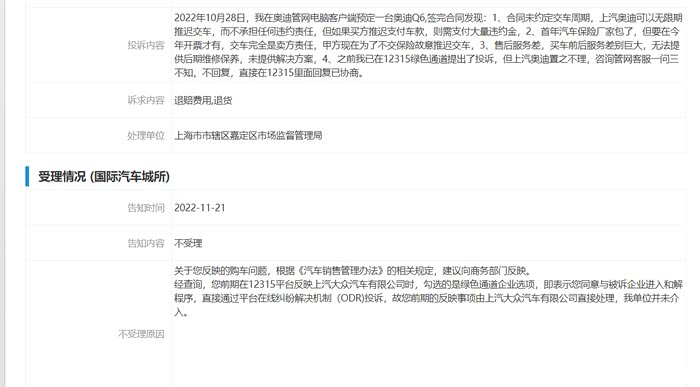4、后面没办法得不到解决办法,到12315反应诉求,不受理,踢皮球建议向商务部门反映。没办法,上汽大众是央企,上海的纳税大户,人家不敢惹。