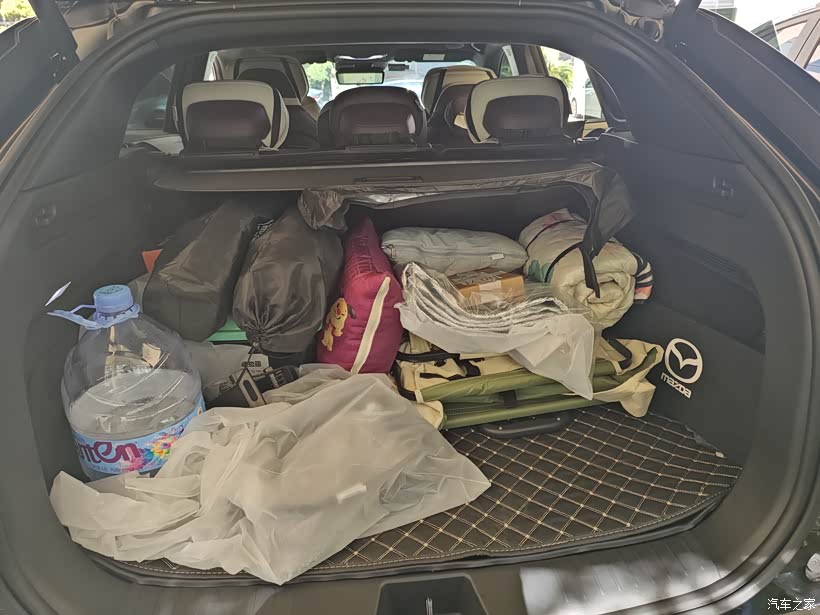 之前CX5后备箱的东西全放进去了,加上白色袋子里的充放电枪,还能放很大一块区域的东西。