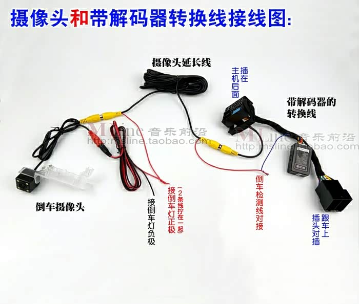 上图中粉色的线就是解码器供电线分出的倒车电源线和信号线,是一根线,倒车时才有12V的电,后摄像头才工作。把他连接到后摄像头延长线的红色线上就可以。