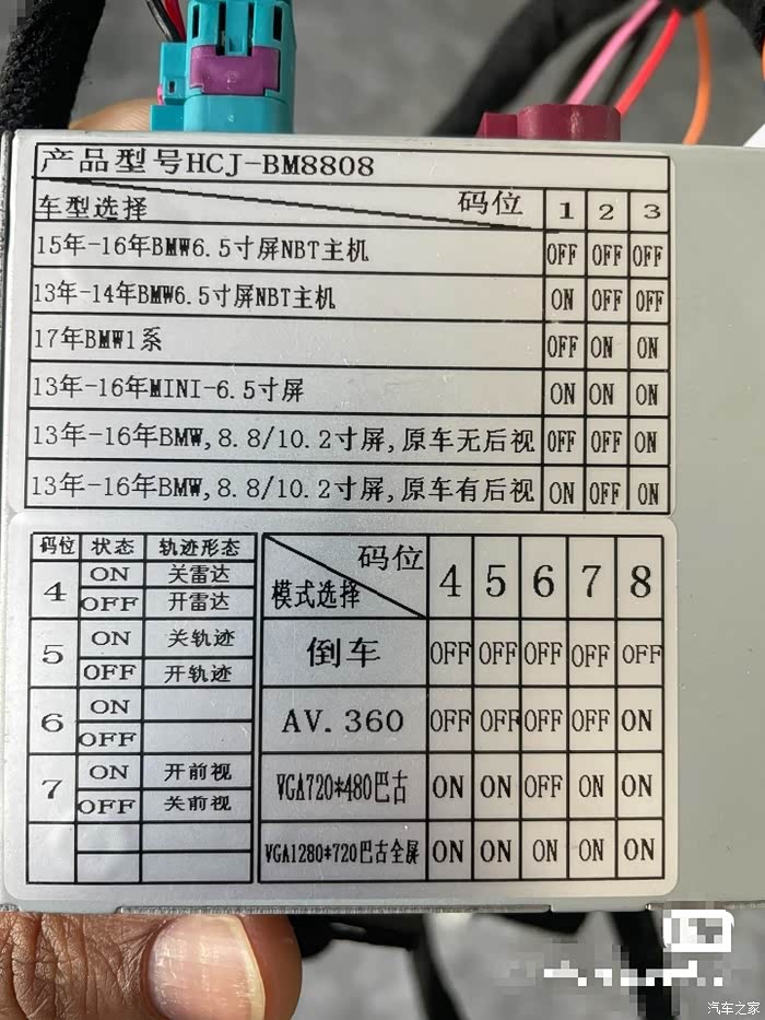 如上图中红色区域就是解码器的拨位开关,拨到向上为on,向下为off,根据背面的说明书拨到对应档位,关闭车的电源(或者拔掉供电口,重新插上通电)启动车辆,倒车,就会有倒车影像了。