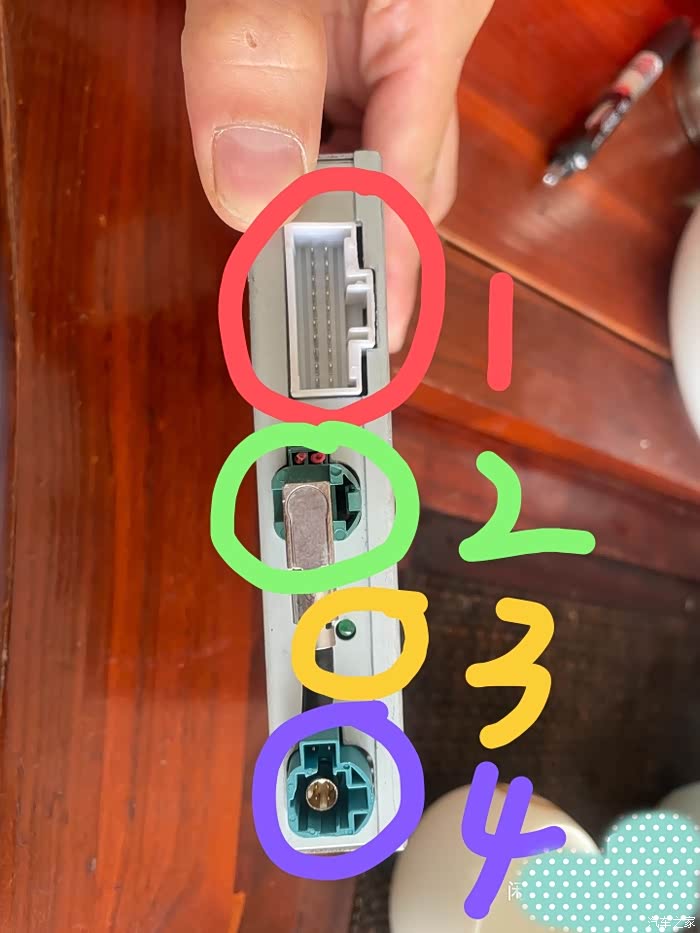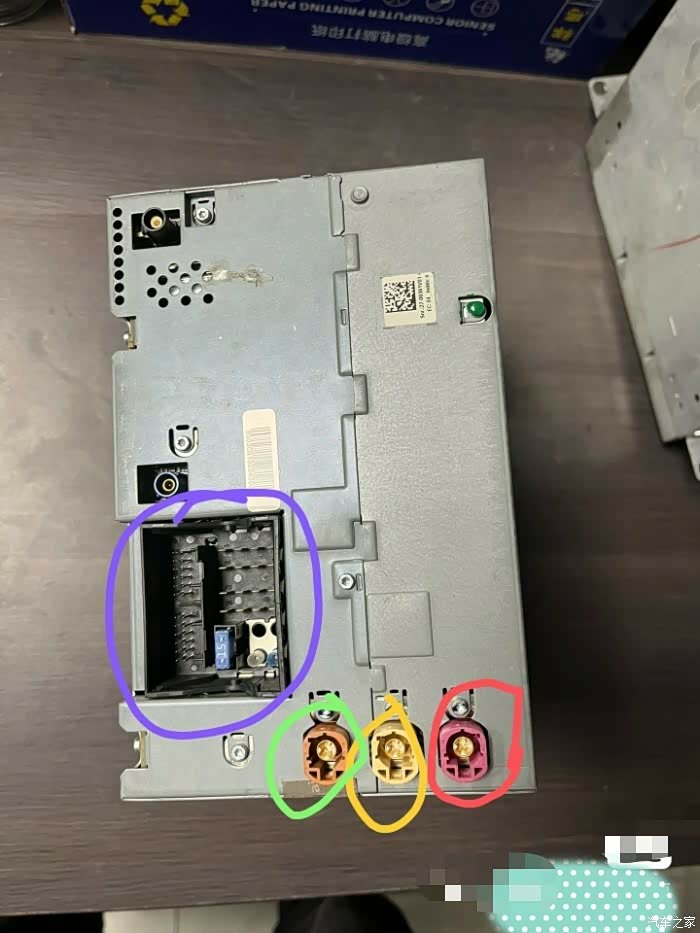 红色圆圈就是原车显示屏接口。原车显示屏通过这个接口与原车主机孔相连(就是再上面那一张图的9号插头),原车显示屏只有一个接口,就这个接口。