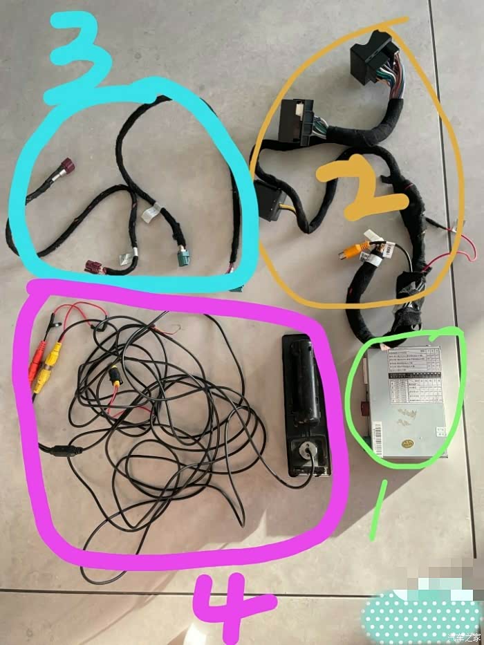 4是倒车摄像头,需要从后面牌照灯到前面主机,所以线很长。