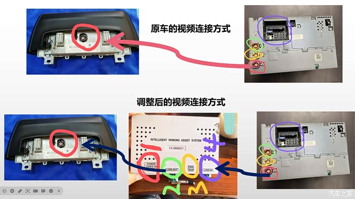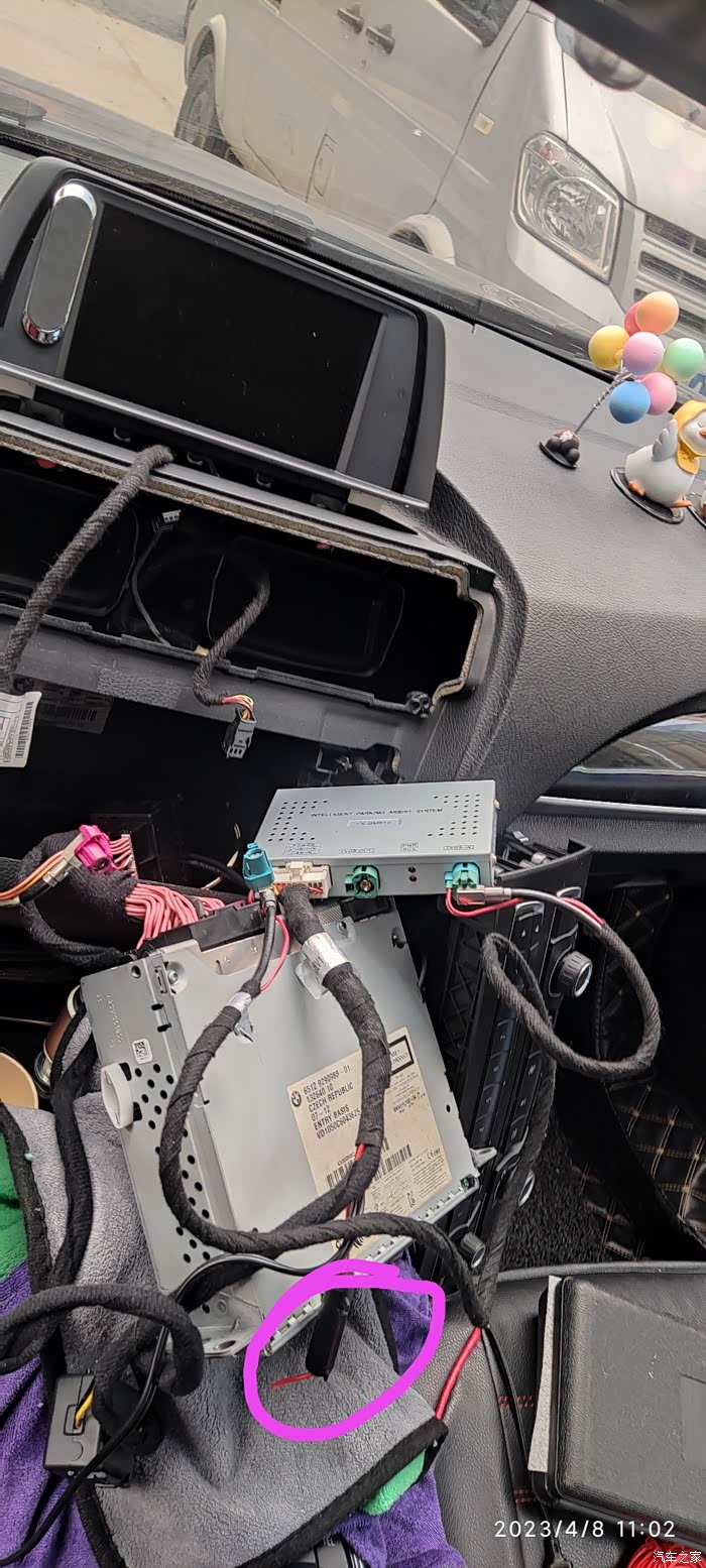 然后视频线穿过后部座椅,沿着汽车边缘卡扣,进入到手套箱。在与中控部分主机的接头连接,此时,形成了闭环。