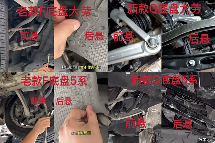 老款宝马集团F底盘用的是奥迪专利合金H臂,再看看现在新款宝马集团G底盘离开奥迪专利,悬架只能铁皮用料