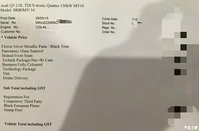选了2.0TDI,我有两个必要的要求,1、天窗(因为澳洲Q5天窗不是标配哦),2、B&O音响。满足这个条件并能快速提车的只有一台,加装了前排座椅加热,但没有后视镜电动折叠,也没有并线辅助,还没有自适应巡航,更没有座椅记忆。由于有B&O于是就有了3GMMI,可以加个SIM卡用G纪Map,颜色是花剑银,国产没有的配色,没见过开始有点没底,但是银的应该没问题。于是砍价吧,有吃吃帮忙,砍价很快结束,毕竟他是老主顾,店里很熟悉。落地7W不到的价格,送贴膜,欧式牌照,脚垫,后备箱垫。提车时还送了一盒零食和一把雨伞,两顶帽子。这边是提车加满油的,所以也算省钱了,并且到车前提供代步车,只有一台Q5 2.0TFSI提供,可惜没其他车,不然选个其他的开。开到现在发现柴油就是起步没有汽油强,但后面高扭矩还是体现出作用了,动力很好!澳洲的Q5都是七速双离合,所以换挡速度没得说,柴油车一般要90码才会换到7档,一般都在5和6档。