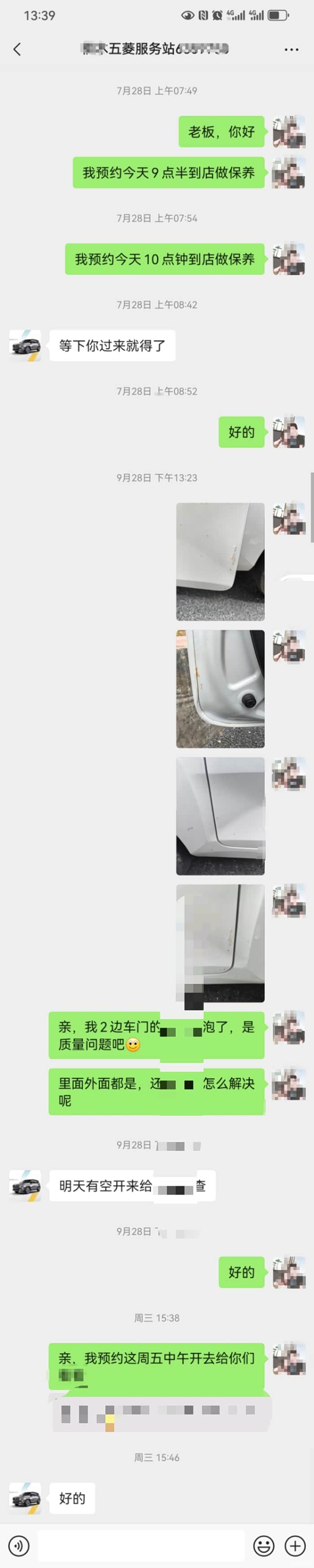 小E是家里第二辆车,给爱人在小县城上下班和买菜用,原版原漆,没有碰过什么,女司机平时不关注车子外观,本人2024年9月28日开车,无意中发现车门生锈了,如果是喷过漆,喷得不好起泡可以理解,但原厂出来三年就不行了,这质量。。。。。。能生到这种程度的锈至少半年以上吧。后开车到买车的店反馈质量问题,商家态度很不友好,连申请厂家售后都不想帮,为此后我叫我爱人直接开车回家,不与争执。而后收到“已过保质期为由”,维修费用我们承担。但是2024年7月28日,我们曾开车到店里保养,店里对此生锈没提任何东西,是没看见(保养前不是先要看车辆外观)还是故意不提(顾客不提店里不提)。