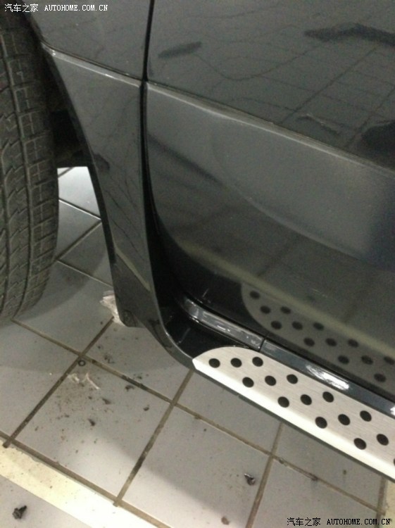 这一款侧踏在外形上来讲,有了很大的改观,几乎与原车完全匹配,说是几乎,主要是塑料件部分制作的还不是很精细,应该是开模时没有掌握好尺寸,主要体现在后侧轮眉塑料件处,材质较厚,角度稍差,但不仔细看发现不了,算是完美吧,如果想精益求精,可以细心打磨一下。这款侧踏的安装需要拆卸科雷傲原车的侧裙,拆掉后,侧踏的组合件将完全替换原来部位,这使得整个侧踏与原车之间的结合天衣无缝。侧裙拆卸后,如果不小心,会损坏部分卡扣,基本就无法还原了,这是需要了解的问题。由于集成了侧裙塑料件,所以侧踏自身颜色也是个问题,厂家自喷的侧踏颜色与原车颜色有色差,看着比较明显,我的这款是因为订购的时候没有火星灰这个颜色,所以发的是未喷漆的件儿,到4S店后自行喷的火星灰,与原车颜色匹配较好。