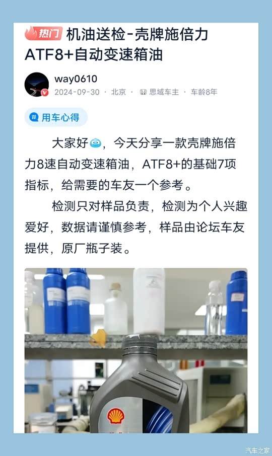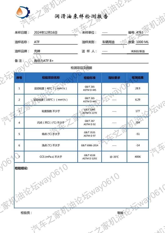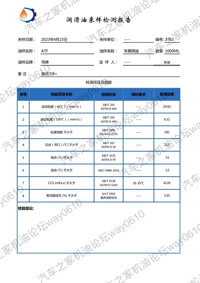,不久前检测了壳牌施倍力ATF8+自动变速箱油的基础7项指标,今天又有车友送检,一起看一下各项指标如何,以及抗剪切能力怎么样!
