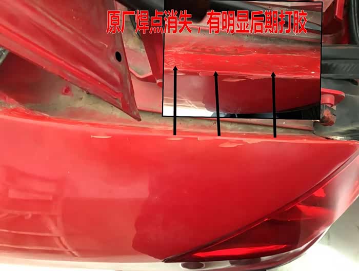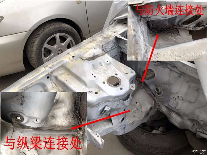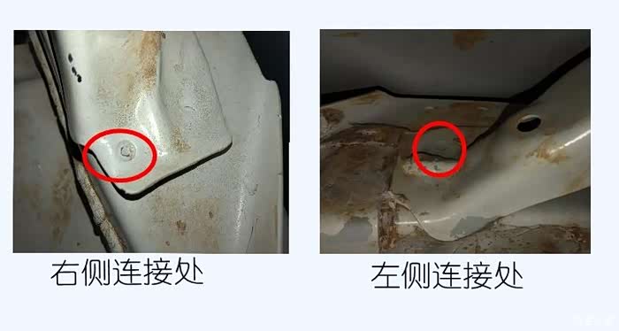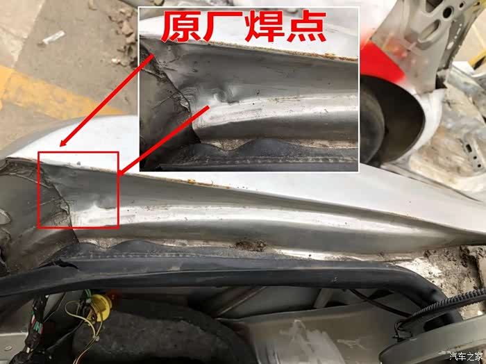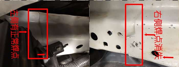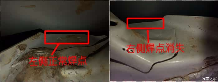 在确认完整体更换情况后,我们还需要判断有无局部更换,局部更换只需查看纵梁自身焊点(一般在纵梁上端或两侧)即可,如果焊点消失或者有后期焊接,那纵梁局部更换没跑了