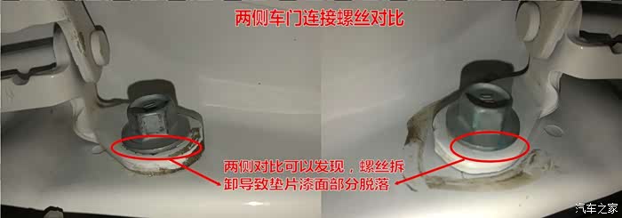OK,这几颗螺丝都有拆卸,那么车门肯定是拆下来过,大家注意,这样还不能完全说明车门换过,因为可能门可能是拆下进行钣金或者喷漆,我们继续寻找线索