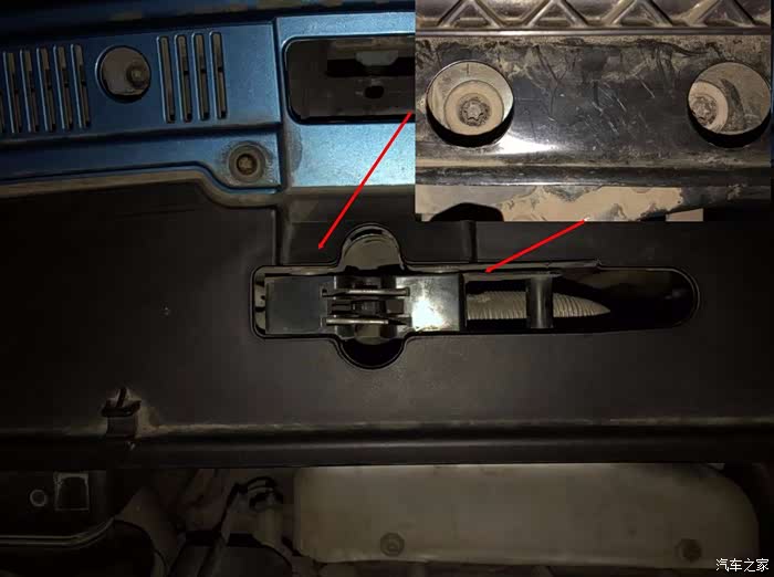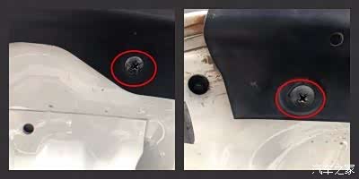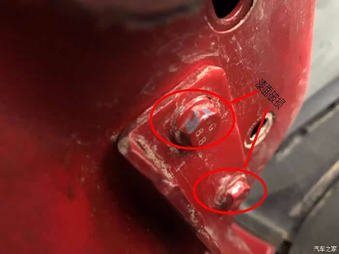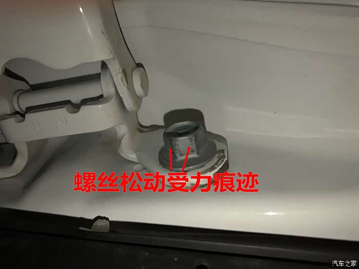 大家可以看到,螺丝漆面破损严重,由此可以判断出螺丝有过拆卸。不过,有一点需要注意,有时候由于使用时间长或有磕碰,漆面也会有些脱落,这种情况大家要注意区分,在检查时,要综合引擎盖左右两侧的连接螺丝拆卸情况得出结论。在实际情况中可能会出现螺丝精修,看漆面的方法可能会失效,但是理念是一样的,这种带漆面的螺丝,要么松的时候保护住漆面,要么后面把漆补上,同样会留下蛛丝马迹的,后面我会就螺丝精修问题继续和大家交流。