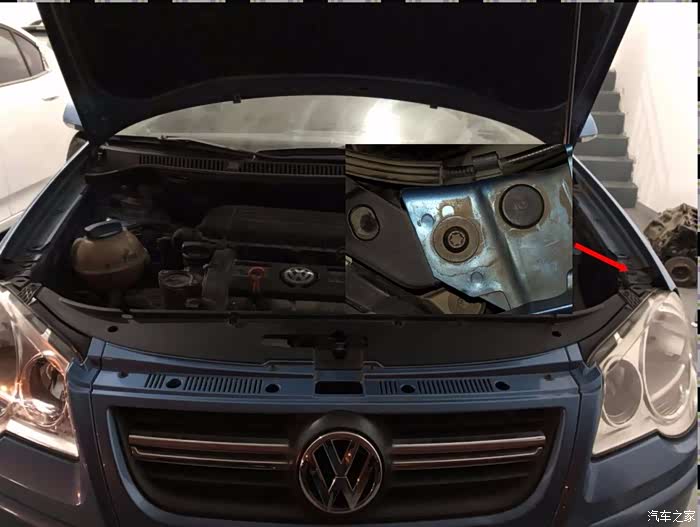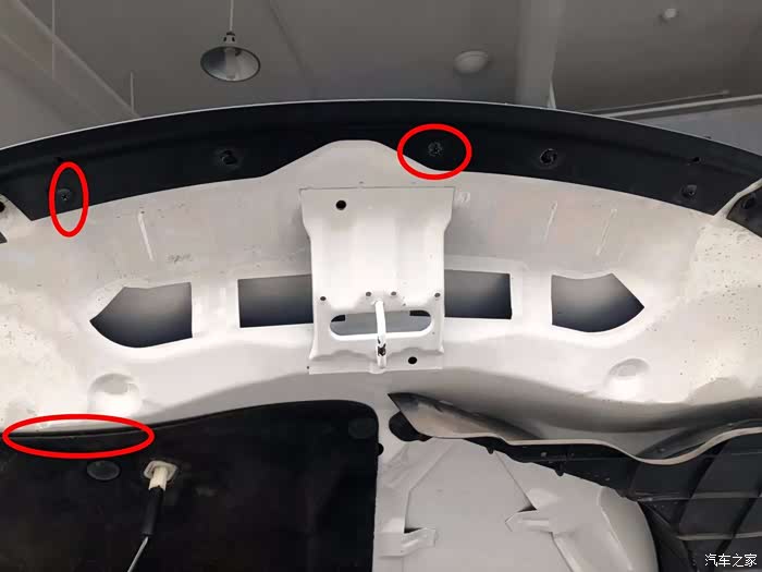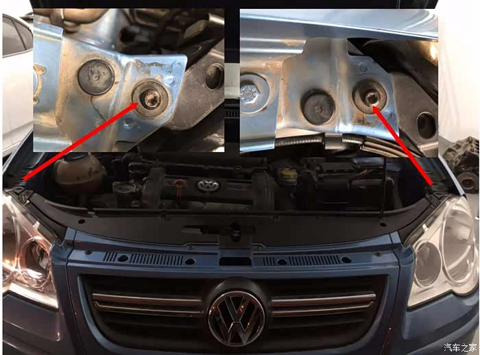 OK,现在可以开始检查了,还是一样,先看更换,再看修。引擎盖一般为螺丝连接,并且带有与车身颜色一致的漆面,我们可以打开引擎盖,查看连接处螺丝拆卸情况,连接螺丝在图中标注位置,左右两边均有,走近观察,确定螺丝拆卸情况