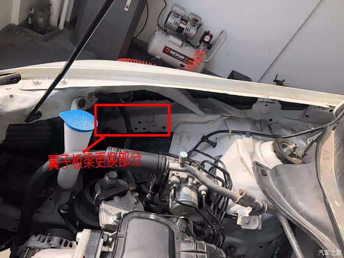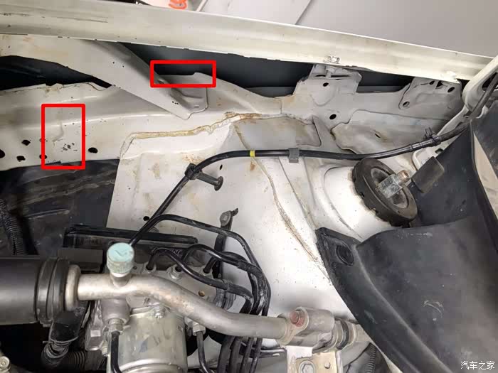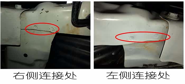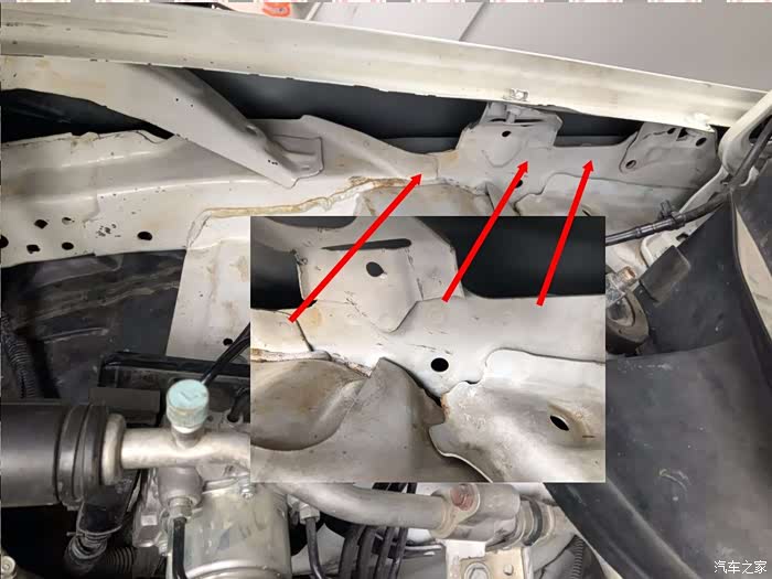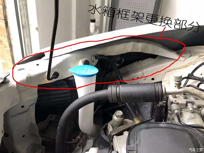 2.局部更换,如果是焊接部分更换,则基本也属于事故车范围了,如果仅是螺丝连接的中段(三段式水箱框架)更换,则程度又要略轻一些,此时,应重点关注纵梁前端和加强梁前端损伤情况;