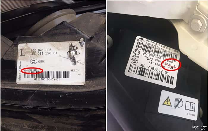 那么,相信大家应该有些头绪了,在实际检车过程中,我们可以以此进行判断,如果连接螺丝拆卸,并且水箱、大灯均有更换(生产日期在汽车出厂日期之后即为更换),同时吸能盒以及锁机拆卸,那么基本上就可以确定水箱框架有更换,可能有小伙伴又要问了,大灯,水箱咋看有没有更换呢?哈哈,不用急,我马上就给大家科普一下吧!大多数的水箱和大灯上面都会有生产日期标识,有些是直接贴有商品标签,这类直接读取生产日期数字即可