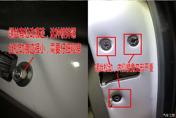 最后也送大家一个小彩蛋,看ABC柱除了看焊点以外,还可以通过一种方法进行辅助判断,那就是看连接在ABC柱上附件的连接螺丝有没有拆卸,正常情况下,这些螺丝基本不会有拆卸的,如果有,那就可以适当怀疑了,如果是大面积的拆卸,那ABC有切割的可能性就更高了,来看看实例