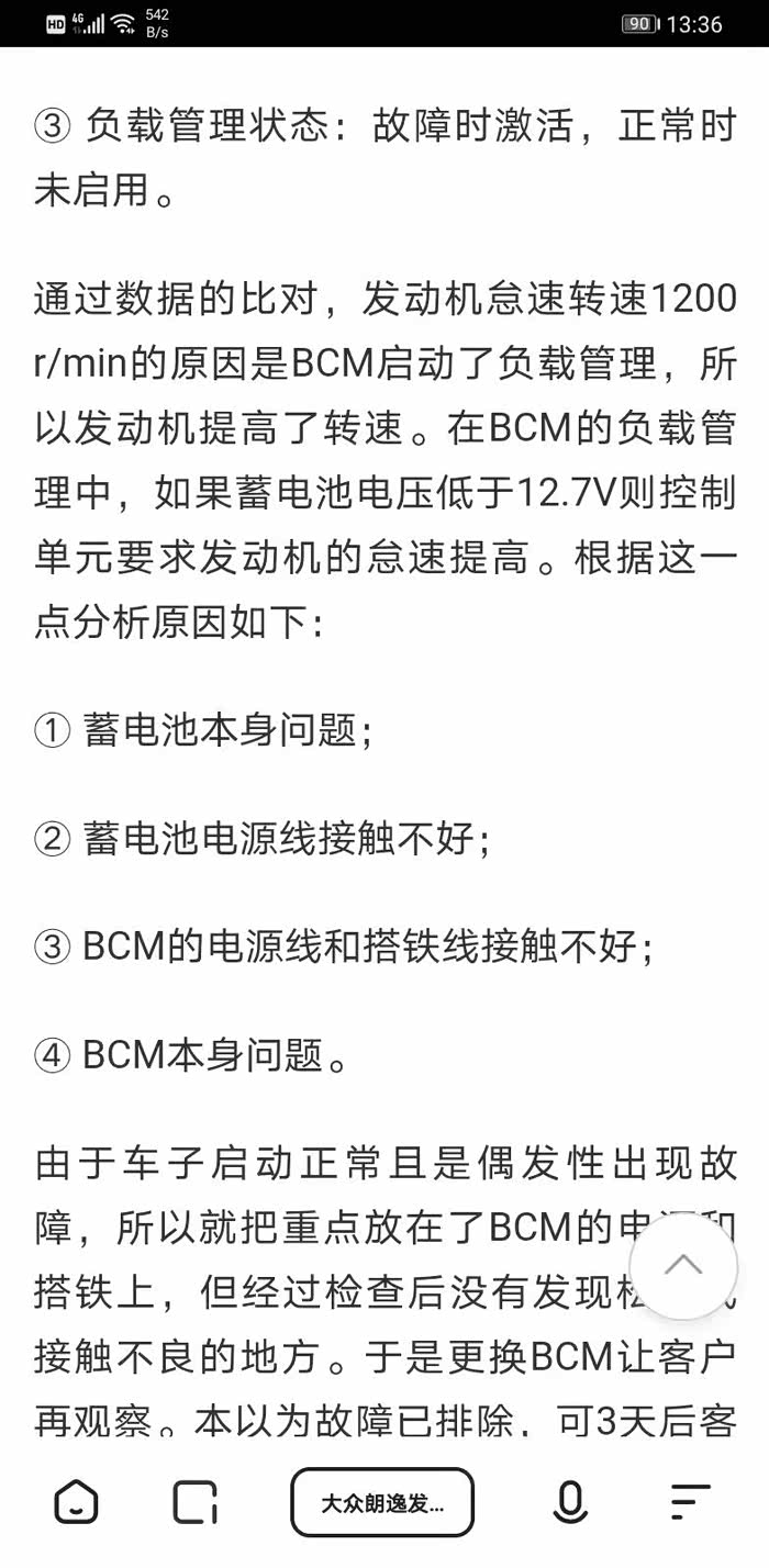 大众朗逸发动机怠速高是什么故障原因?© 有车就行 / 2020-11-15 10:14 / 1052人浏览故障车型:配置EA2111.6L发动机。VIN:LSVNV6183D2XXXXXX。行驶里程:2.6万km。故障现象:有时候怠速时发动机转速高。故障诊断:客户来站反映有时候怠速转速在1000r/min以上下不来。着车怠速正常,出站试车正常,后来维修人员就检查了一下让客户再跑跑看,并告知如再出现把车停下来打电话,第二天客户打来电话说故障又出现,到现场后一看发动机怠速时的转速在1200r/min,于是读取相关的数据流后把车开到站里检查。使用诊断仪对该车进行检测发现系统无故障码。观察01数据:发动机转速在1200r/min左右,节气门开度稍微偏大,加速踏板位置正常,发电机负荷稍微偏大。观察09数据:① BCM参考电压:故障时14.08V,正常时13.82V;② BCM30号端子电压:故障时14.34V,正常时13.95V;③ 负载管理状态:故障时激活,正常时未启用。通过数据的比对,发动机怠速转速1200r/min的原因是BCM启动了负载管理,所以发动机提高了转速。在BCM的负载管理中,如果蓄电池电压低于12.7V则控制单元要求发动机的怠速提高。根据这一点分析原因如下:① 蓄电池本身问题;② 蓄电池电源线接触不好;③ BCM的电源线和搭铁线接触不好;④ BCM本身问题。由于车子启动正常且是偶发性出现故障,所以就把重点放在了BCM的电源和搭铁上,但经过检查后没有发现松动或接触不良的地方。于是更换BCM让客户再观察。本以为故障已排除,可3天后客户再次来站。再次用诊断仪检查,这次09里有故障码“1598蓄电池电压(tbd偶发)”。根据故障码检查蓄电池正负极连接线,结果发现问题,即该车蓄电池负极搭铁线接触不良。故障排除:对蓄电池负极线进行打磨处理,恢复拆装部件后故障排除。故障总结:故障点主要是因为蓄电池负极线接触不良所致,当确定BCM启动负载管理时,在排查的过程中由于认为一些所谓“正常”的现象,造成了误判,所以走了一点弯路。