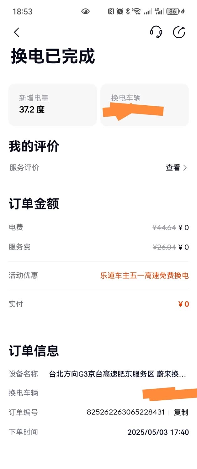 然后5.3从老家回合肥,临近下高速到肥东服务区薅了一次蔚来5.1假期高速免费换电的羊毛,3分钟换电满电出发,买这个车只要提前做好出行规划真是没有一点能耗焦虑。